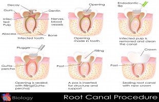 Kanal tedavisinin aşamaları 1. Öncelikle ağrısız ve acısız bir tedavi olması için diş e anestezi yapılır. 2. Daha sonra çürük temizlenip, diş in özüne ulaşılınca hastalıklı ve yumuşak doku çıkarılır. Sinir ve doku artıkları temizlenir. 3. Kök ucuna kadar diş kanalına şekil verilir. Bazı ilaçlar ile kanallar yıkanarak (dezenfektan ve antimikrobiyal solüsyonlar) iyileşme hızlandırılabilir. 4. Seanslar arasında diş iyileşene kadar geçici dolgu maddeleriyle diş in üzeri kapatılır. İltihabın üremesinin durduğu anlaşıldıktan ve kök ucundan iltihap gelmesi sona erdikten sonra kanal içerisi özel bir dolgu maddesiyle, kök ucuna kadar doldurulur. 5. Bazı vak'alarda bu seanslara hiç gerek olmayıp tek bir seansta da kanal tedavisini sağlıklı bir şekilde kanal tedavisini bitirmek mümkündür. 6. Kanal doldurulduktan sonra ağızda görünen kısmına normal dolgu ve gerekirse kaplama yapılır.